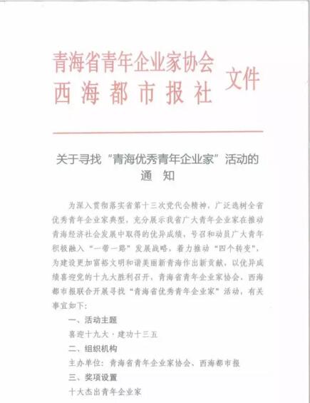 為深入貫徹落實省第十三次黨代會精神,廣泛選樹全省優(yōu)秀青年企業(yè)家典型,充分展示我省廣大青年企業(yè)家在推動青海經(jīng)濟社會發(fā)展中取得的優(yōu)異成績,號召和動員廣大青年積極融