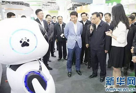 10月19日,中共中央政治局常委、國務(wù)院總理李克強在北京出席首屆“全國大眾創(chuàng)業(yè)萬眾創(chuàng)新活動周”,并考察主題展區(qū)。這是李克強在與百度公司自主研發(fā)的機器人交談。